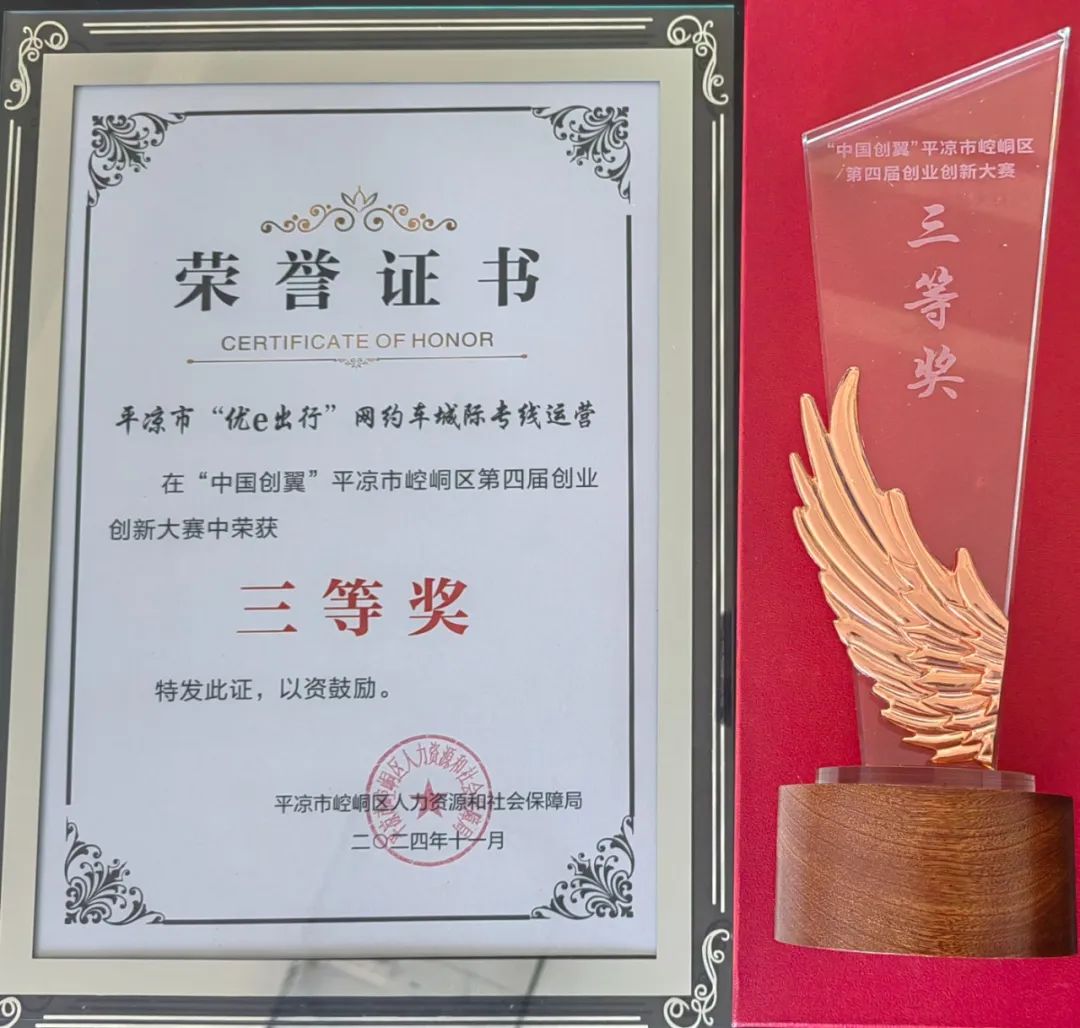 孵化基地由胡金鵬代表平?jīng)鲂履芰科嚪?wù)有限公司參賽的《平?jīng)鍪小皟?yōu)e出行”網(wǎng)約車城際專線運(yùn)營》項目獲得創(chuàng)業(yè)項目組三等獎