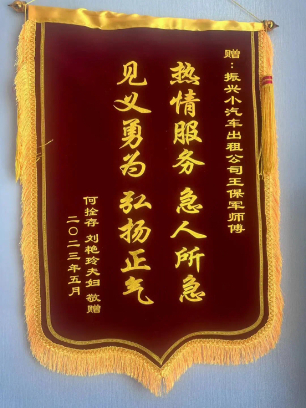 2023年5月23日,振興出租公司收到了何拴存、劉艷玲夫婦送來(lái)一面錦旗,贊許甘L82644車輛駕駛員王保軍師傅“熱情服務(wù) 急人所急 見義勇為 弘揚(yáng)正氣”。